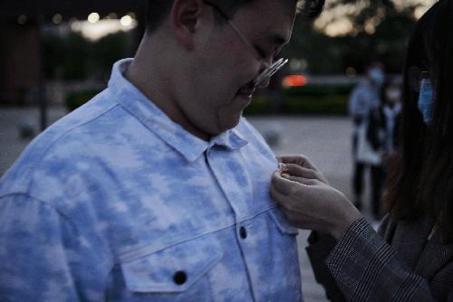 活动第第二部分,重温入团仪式。在校本部西门的初心广场“不忘初心”彩车前,乱交 分团委带领广大团员重温了入团仪式,并为今年新发展团员佩戴了团徽。新老团员一同奏唱嘹亮的国歌,重温了入团的庄严誓词,新老团员代表分别发言,老团员为新团员佩戴团徽。仪式在充满朝气的团歌中结束。